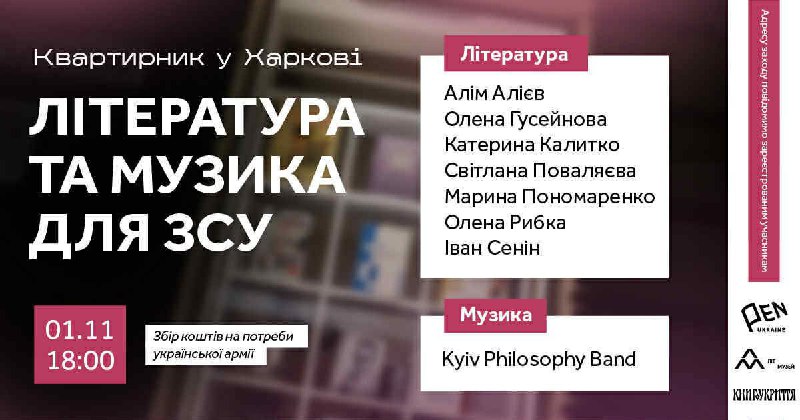 Музично-літературний квартирник у Харкові! література та музика для війська – наші квартирники PEN Ukraine подорожують Україною 27.10.2025, Понеділок | 20:13 Музично-літературний квартирник у Харкові! література та музика для війська – наші квартирники PEN Ukraine подорожують Україною більше інформації: https://www.facebook.com/events/1148893750144234 реєстрація: https://forms.gle/oWM3MZinc7UWdQet5(про місце скажемо зареєстрованим) Катерина Калитко Marina Ponomarenko Svitlana Povalyaeva Alim Aliev Olena Huseinova Ivan Senin Rybka Olena Vakhtang Kebuladze PEN Ukraine Друк / PDF