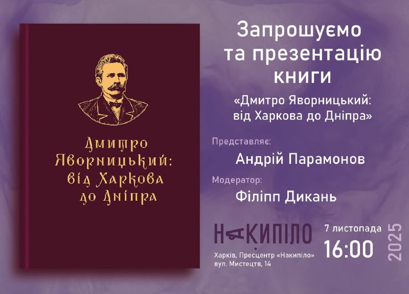 Вітання друзі! 7 листопада запрошую на першу проезентацію в Харкові нової книги про Дмитра Яворницького. 3.11.2025, Понеділок | 11:52 Вітання друзі!7 листопада запрошую на першу проезентацію в Харкові нової книги про Дмитра Яворницького. Андрій Парамонов Друк / PDF