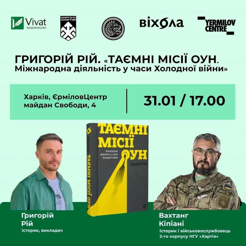 У суботу 31 січня, о 17.00, в харківському ЄрміловЦентрі відбудеться чергова зустріч із циклу популярних під час війни лекцій «Як подолати росію: спитай історика». Цього разу відбудеться презентація книги Григорія Рія «Таємні місії ОУН. Міжнародна діяльність у часи Холодної війни». Спираючись на розсекречені архіви ЦРУ, британської розвідки, колишніх совєтських спецслужб і Архіву ОУН у Лондоні, автор показує неміфологізований образ українських націоналістів в еміграції – як учасників складної, багаторічної дипломатичної та політичної гри. Модерує захід історик і військовослужбовець 2-го корпусу НГУ «Хартія» Вахтанг Кіпіані.