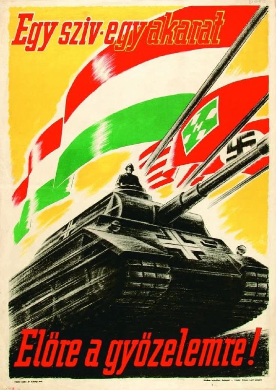 На світлині: угорський плакат часів Другої світової війни, 1944 р. На ньому напис: «Одне серце, одна воля, вперед до перемоги!» – із зображенням танка, що наступає з прапорами Угорщини та нацистської Німеччини.