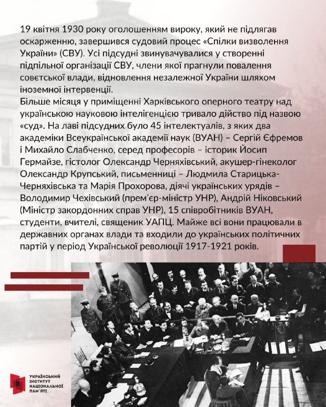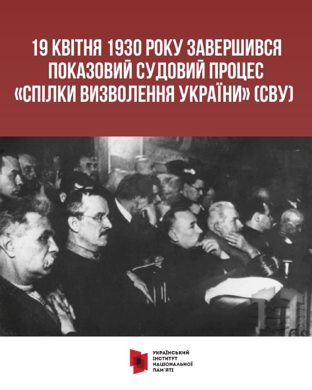 19 квітня 1930 року завершився один із наймасштабніших показових процесів радянської епохи — справа «Спілки визволення України». На лаві підсудних — науковці, письменники, міністри УНР.