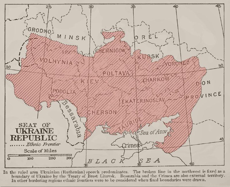 Американська мапа України за Берестейським миром із зображенням етнічних меж українців, 1918 рік.Джерело: Визвольні змагання