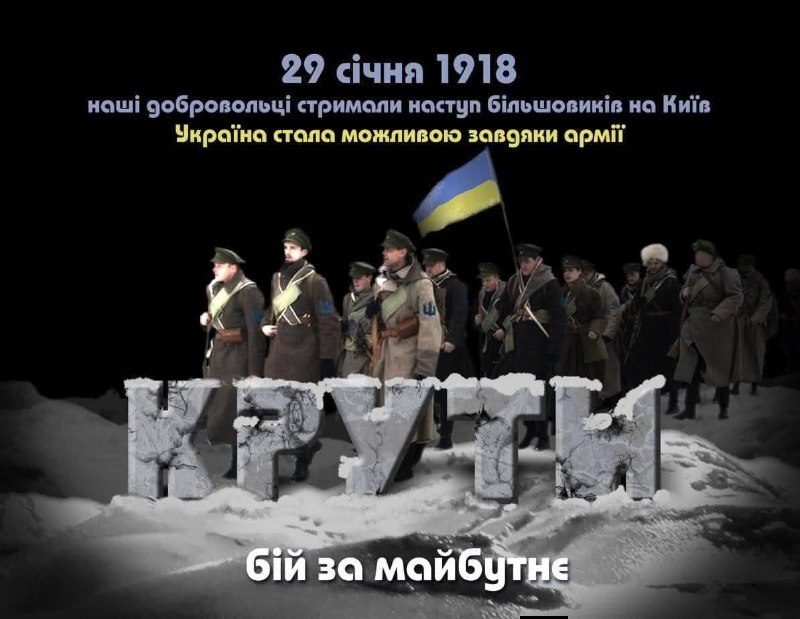 День пам’яті Героїв Крут 29 січня в Україні віддають шану українським студентам, які ціною власного життя зупинили більшовицький наступ на Київ у 1918 році. Цього дня прийнято віддавати данину стійкості та мужності молодих хлопців, які так само, як і сьогоднішні воїни ЗСУ, стали на захист української держави від зовнішнього агресора.Бій під Крутами - як це було.Наприкінці грудня 1917-го більшовицька влада Радянської Росії розпочала відкриту агресію проти Української Народної Республіки. Її дратувало проголошення Україною незалежності, тому москвою було створено окремий "український червоний уряд" у Харкові, який оголосив війну незалежній частині держави.Наступ більшовиків військове командування України очікувало з Полтавського напрямку і відправило туди свіжі та найбоєздатніші підрозділи. Однак атака почалася з іншого боку.У грудні 1917 року станцію Бахмач на Чернігівщині - важливий залізничний вузол на кордоні УНР і росії - охороняв загін Першої української військової школи ім. Б. Хмельницького. На початку 1918 року до них надійшло підкріплення з Києва - 1-ша сотня Куреня студентів Січових Стрільців. Це були студенти Українського народного університету, київського Університету Святого Володимира (нині ім. Т. Шевченка), гімназисти старших класів. Вони зайняли оборону біля станції Крути, що за 130 км від Києва.Вранці 29 січня 1918 року більшовики пішли в наступ. За різними даними їх було від 4 до 6-7 тисяч. З українського боку в бою під Крутами брали участь 300-600 бійців. Бій тривав кілька годин: було відбито кілька атак, бойові втрати більшовиків становили до 300 убитих, без урахування полонених і поранених.Українським військам віддали наказ відійти, щоб уникнути оточення. Однак, відступаючи, частина студентської сотні потрапила в оточення - у сутінках вони втратили орієнтир і вийшли на станцію Крути, яку вже контролювали червоноармійці. Близько 30 юнаків узяли в полон, катували та стратили. Їх поховали біля Аскольдової могили. Усі вони - герої Крут, але прізвища відомі лише 19 захисників. На їхню честь Павло Тичина написав вірш "Пам'яті тридцяти".У 2006 році на місці бою під Крутами встановлено пам'ятник.До 80-ї річниці бою було випущено пам'ятну монету номіналом 2 гривні.У 2019 році на екранах з'явилася історична драма Олександра Шапарева "Крути 1918". Бій під Крутами є не тільки трагічною сторінкою в історії нашої країни, а й відображає непохитну боротьбу українців за незалежність нашої держави. "Пам’яті тридцяти". Павло Тичина, 1918р. Бійцям київського Студентського Куреня, які загинули в битві під Крутами.На Аскольдовій МогиліПоховали їх —Тридцять мучнів українців,Славних молодих...На Аскольдовій МогиліУкраїнський цвіт —По кривавій по дорозіНам іти у світ.На кого посміла знятисьЗрадницька рука?Гріє сонце, грає вітерІ Дніпро-ріка...На кого завзявся КаїнБоже, покарай! —Понад все вони любилиСвій коханий край.Вмерли в Новім ЗаповітіЗ славою святих. —На Аскольдовій МогиліПоховали їхНа Аскольдовій МогиліУкраїнський цвіт —По кривавій по дорозіНам іти у світ.ООМЦКМ