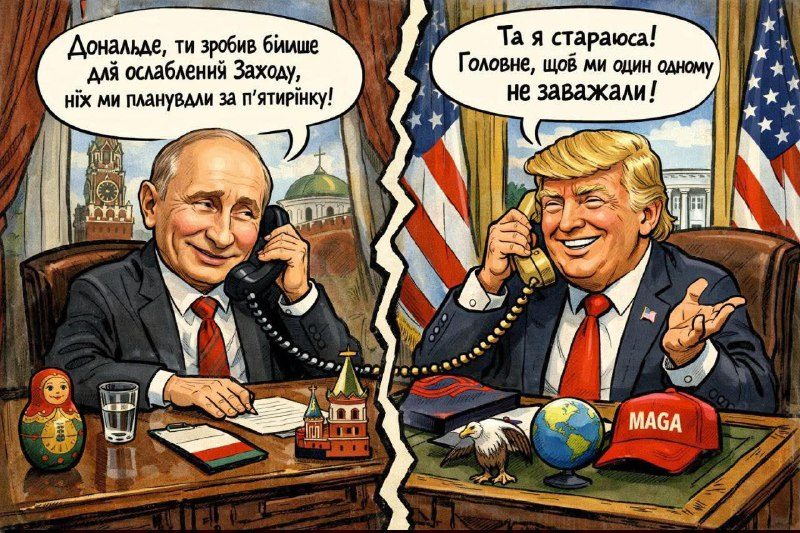 📞 Наші джерела повідомляють:Владімір Путін зателефонував Дональду Трампу з нагоди річниці інавгурації.— Дональде 🤝, вітаю. Ти за цей рік зробив більше для ослаблення Заходу 🌍, ніж ми планували за цілу п’ятирічку 📉, — сказав Путін, не приховуючи задоволення 😏.У відповідь Трамп засміявся 😂 і заявив:— Та я стараюся! 🇺🇸 Головне, щоб ми один одному не заважали 📞➡️📞.Після цього співрозмовники домовилися 🤝 і надалі не втручатися у справи один одного,бо, за словами наших джерел, обидва чудово справляються самі 🔥🤡.Ігор Синько