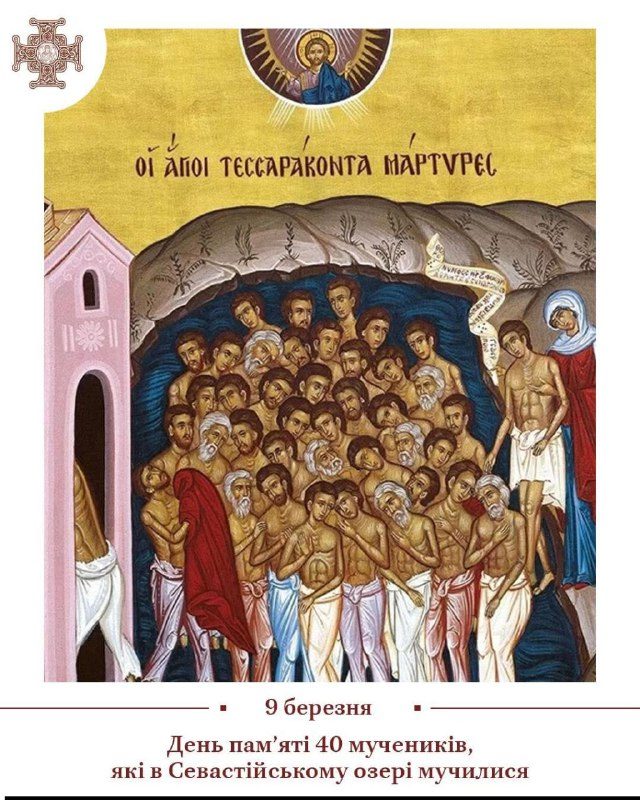 9 березня Українська Церква вшановує сорок мучеників-воїнів, які за віру в Господа нашого Ісуса Христа були на смерть замучені в холодному Севастійському озері своїми воєноначальниками. Це відбулося близько 320 року, за царювання імператора-язичника Лікінія, який чинив жорстоке гоніння на християн у Східній частині Римської імперії. Тоді Вірменія з містом Севастією (північно-східна частина Малої Азії) входила до складу цієї імперії. Згадані сорок воїнів складали особливу почесну гвардію імператорського війська, вони були освіченими, вправними і мужніми воїнами. Але, на відміну, від іншої частини війська, вірили в істинного Господа, а не поклонялись ідолам. Їхній воєвода Агриколай хотів намовити їх відректися від правдивого Бога та принести жертву ідолам, як наказував імператор, але ті воїни відмовились. За непокору їх ув՚язнили, потім жорстоко катували, знущалися, підкуповували й ображали. А коли зрозуміли, що все це марно, то зв՚язаними притягли їх до багатоводного озера, що знаходилося біля міста Севастія. Тоді було зимно і дув сильний вітер. Надвечір святих воїнів роздягненими залишили у крижаній воді, а над ними поставити вартових і спорудили теплі лазні на березі, щоби спокушати мучеників відректися від Бога заради земних благ. Житіє оповідає, що о першій годині ночі один із сорока воїнів, не витримавши холоду, відокремився від інших і побіг у лазню. Але ледве він ступив на поріг і відчув теплоту, як впав мертвим. Інші воїни в той час молилися до Бога. І о третій ночі їх осяяло світло, яке зігрівало воїнів і не давало їм померти. Побачивши це чудо, один із вартових помітив у небі 40 сяючих вінців, що сходили на голови святих воїнів. Він увірував у Бога і приєднався сороковим до числа цих страждаючих святих, аби замість земних благ отримати вінець небесний вічного життя. Вранці мучителі побачили живими сорок воїнів-християн, розлютилися і забили їх на смерть. Ці сорок мучеників були взяті на страждання за Христа 26 лютого, а віддали душі свої Господу в дев’ятий день березня. Пам՚ять святих сорока мучеників у всіх найдавніших місяцесловах на Сході і Заході зараховувались до числа свят і пам’яті найбільш шанованих святих. Святі славні сорок мучеників Христових, моліть Бога за нас! ПЦУ