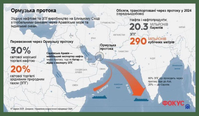 Іран оголосив блокаду Ормузької протоки. Рух нафтових танкерів призупинено.Через цю протоку проходить перевезення приблизно третини світового зрідженого природного газу та майже чверті всієї нафти, яку споживає світ. У найвужчому місці її ширина – лише близько 40 км. У разі перебоїв світ може негайно зіткнутися з серйозними затримками постачання нафти.Джерело: Інсайдер ЗСУ