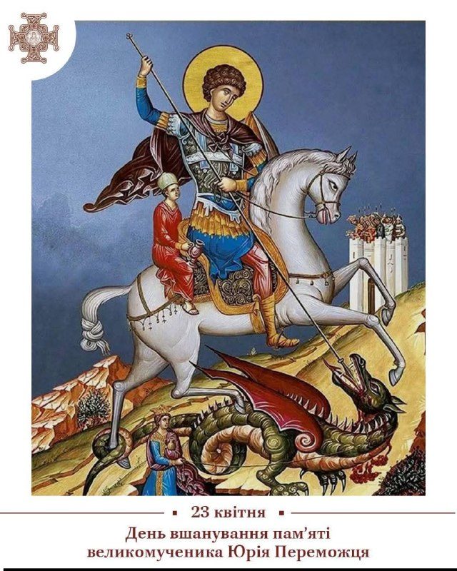 23 квітня - День вшанування пам'яти Святого Юрія ПереможцяСвятий Юрій жив в кінці ІІІ століття, в часи правління нечестивого римського імператора Діоклетіана, який був ярим ідолопоклонником та запеклим гонителем християн. У його війську служив дивний Христів воїн, родом з Каппадокії, син християнських батьків, змолоду вихований ними у благочесті – Юрій. Великих висот досяг цей молодий воїн на військовій службі, а тому був долучений до оточення імператора. Однак, коли імператор запалав ненавистю до християн та наказав по всій імперії здійснювати проти них криваві гоніння та страчувати тих, хто не зречеться своєї віри і не поклониться римським ідолам, тоді Юрій між успішною військовою кар’єрою і прихильністю володаря з одного боку та своєю вірою з іншого – обрав віру. За це його позбавили звання, піддали різноманітним тортурам і присудили до страти. Помер святий Юрій як мученик 23 квітня 303 року, залишившись непереможним свідком віри.З давнього часу шануємо ми цього святого як Переможця. В грецькій мові цей титул означає «той, хто несе трофей», тобто несе зброю, захоплену в бою, як знак перемоги над ворогом. Яку перемогу здобув святий Юрій? Він, найперше, переміг ті пристрасті, які притаманні кожній людині. Він відкинув велику славу, яку мав на той час, він не спокусився на принади світу цього, не зрікся віри і правди, а боровся до кінця. Він переміг своїх гонителів і мучителів, бо пам՚ять про них загинула, а про святого Юрія як мужнього воїна, хороброго та непереможного свідка Христового – живе і житиме далі. Цей святий мученик, віддавши життя, але не порушивши вірності Богу, переміг духовно і своїм подвигом надихає до боротьби численні покоління християн.Святий великомученику Юрію, моли Бога за нас, наших воїнів-захисників і за весь побожний український народ!ПЦУ